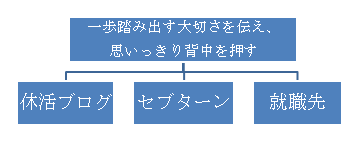この目的(=ビジョン)を達成するための手段(=事業)が休活ブログであり、セブターンであり、来年就職するであろう会社というイメージです。